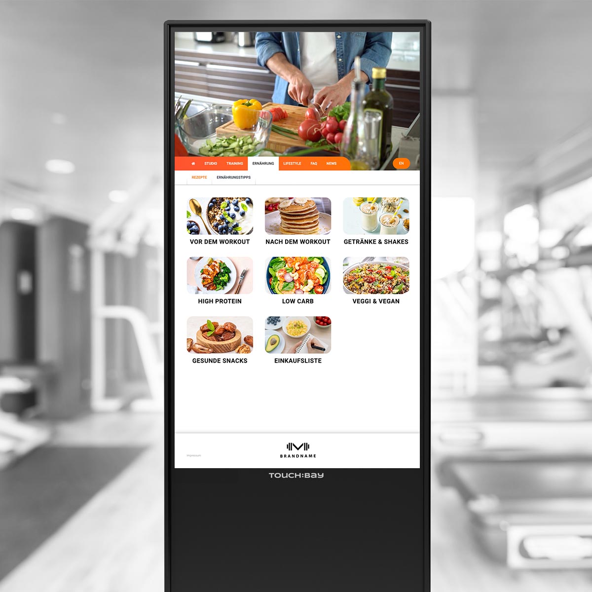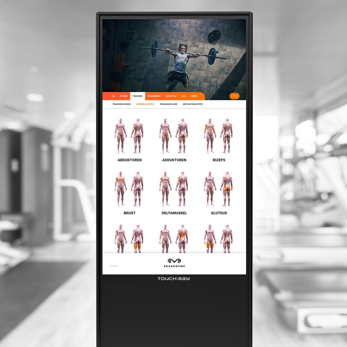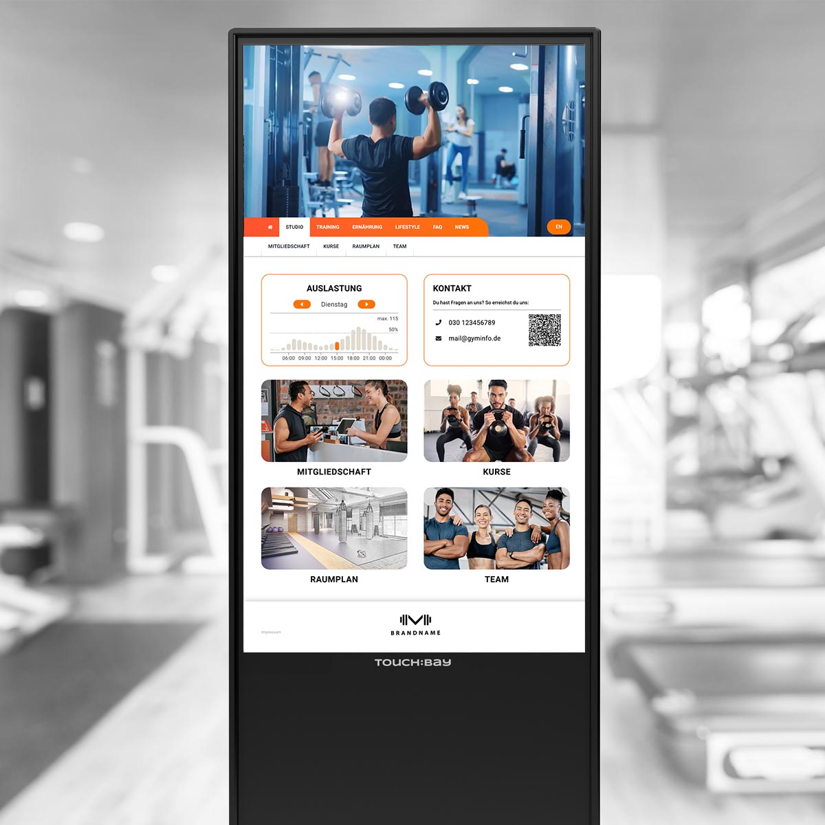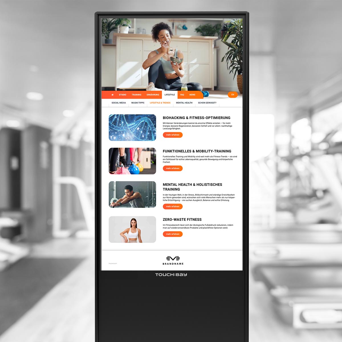 TOUCH:BAY entlastet das Team und informiert Mitglieder – Trainingswissen, Services und Studioinformationen – interaktiv über den Touchscreen, jederzeit direkt im Studio.